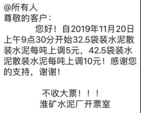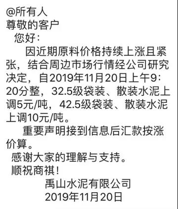 安徽众联水泥有限公司通知称根据当前市场形势经我公司研究决定,自2019年11月20日早8:00点起所有水泥品种价格统一上调10元/吨。