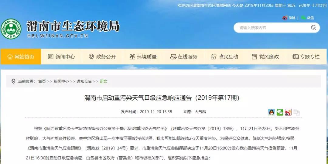 根据《陕西省重污染天气应急指挥部办公室关于提示应对重污染天气的函》(陕重污染天气办发〔2019〕18号),11月21日至28日,受不利气象条件影响,大气扩散条件较差,关中地区将出现一次中度至重度污染过程,我市可能出现连续2-3天重度污染。为保护公众健康,降低大气污染强度,按照《渭南市重污染天气应急预案》(渭政发〔2019〕34号)要求,渭南市重污染天气应急指挥部决定于11月20日16:00时发布渭南市重污染天气橙色预警,11月21日16:00时启动Ⅱ级应急响应,由各县市区政府(管委会)和市级相关部门,组织实施应急措施。工业企业减排措施。纳入重污染天气应急减排清单的工业企业落实“一厂一策”实施方案。属于《技术指南》中涉及钢铁、有色、化工、焦化、铸造、建材、其他等7大类31个行业,参照《技术指南》执行,减排措施力度不低于《技术指南》要求。石材加工、非金属矿物制品业、非煤矿山开采、木材加工和木、竹、藤、草制品加工、橡塑制品加工等行业停产。