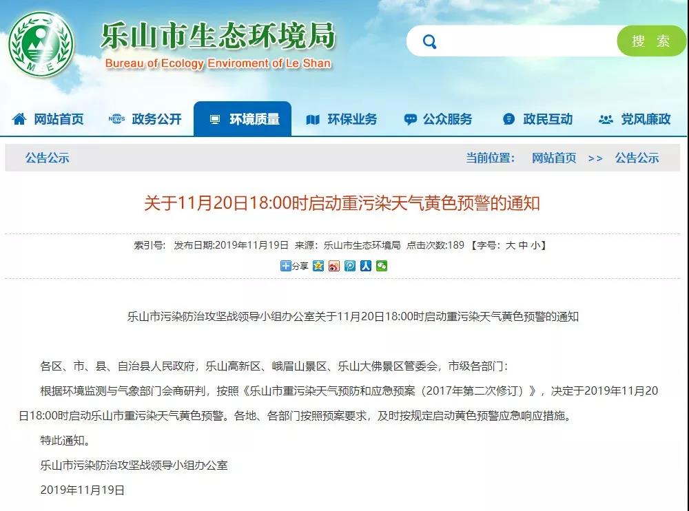 11月19日乐山市污染防治攻坚战领导小组办公室布《关于11月20日18:00时启动重污染天气黄色预警的通知》称:根据环境监测与气象部门会商研判,按照《乐山市重污染天气预防和应急预案(2017年第二次修订)》,决定于2019年11月20日18:00时启动乐山市重污染天气黄色预警。各地、各部门按照预案要求,及时按规定启动黄色预警应急响应措施。