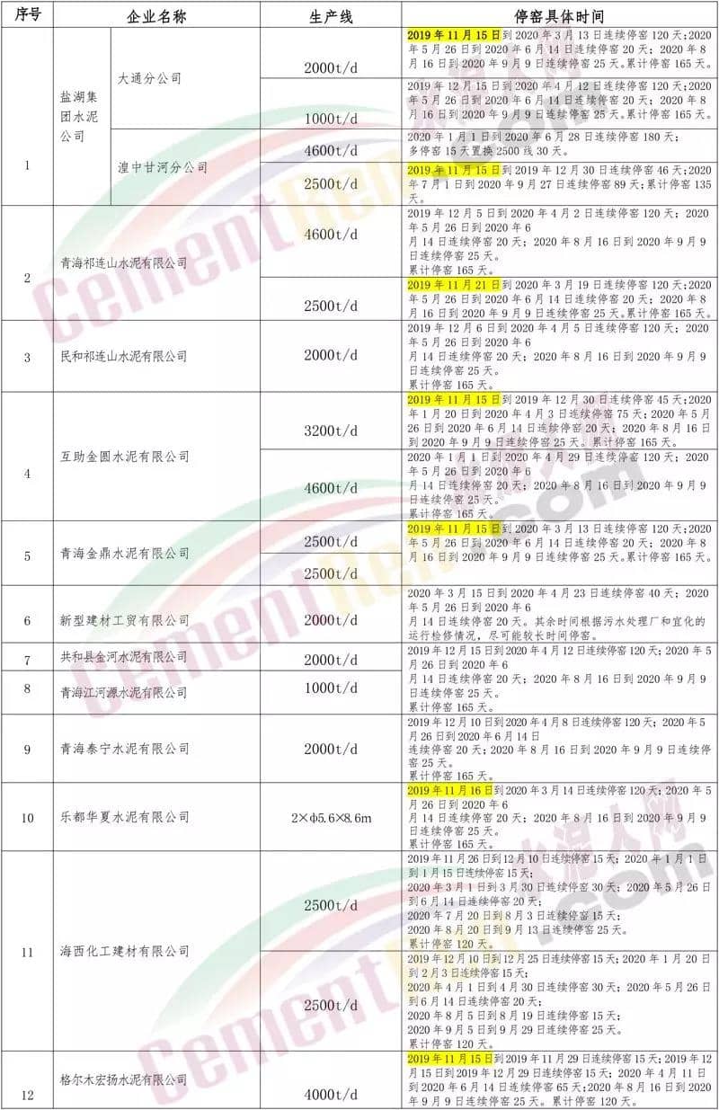 青海省水泥企业错峰停窑计划(2019-2020年)