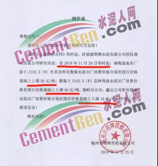 梅州市塔牌营销有限公司发布了调价函称,依照《水泥购销合同》的约定,决定自2019年11月26日零时起,福梅基地各厂除P.II42.5(R)外其余所有散装水泥出厂结算价格在现行价格基础上上调30元/吨,散装P.II42.5(R)品种等级水泥出厂结算价格在现行价格基础上上调40元/吨,蕉岭分公司、鑫达分公司所有袋装水泥出厂结算价格分别在现行价格基础上上调10元/吨。