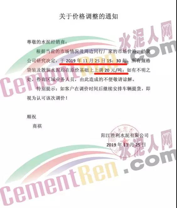 阳江胜利水泥有限公司发布了关于价格调整通知称,根据当前的市场情况及周边同行厂家的市场价格,于2019年11月25日15:30起,所有规格袋装及散装水泥均在原价基础上上调20元/吨。