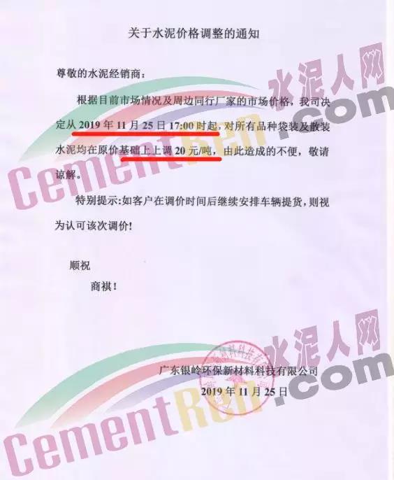 广东银铃环保新材料科技有限公司发布了关于水泥价格调整的通知称,根据市场情况及周边同行厂家的市场价格,决定从2019年11月25日17:00时起,对所有品种袋装及散装水泥均在原价基础上上调20元/吨。