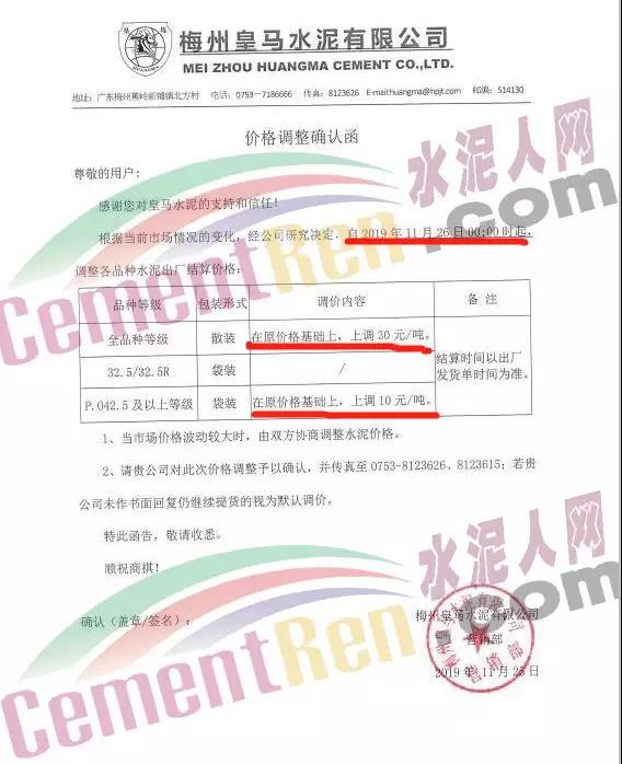 梅州市皇马水泥有限公司发布了价格调整确认函,根据当前市场情况变化,决定自2019年11月26日00:00时起,全品种等级散装在原价基础上,上调30元/吨,P.O42.5及以上等级袋装在原价格基础上,上调10元/吨。