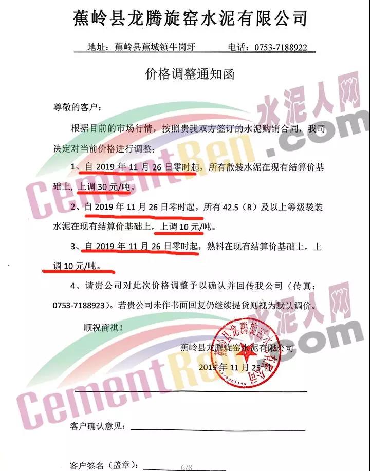 蕉岭县龙腾旋窑水泥有限公司发布了调价函称,根据目前的市场行情,按照贵我双方签订的水泥购销合同,对水泥价格进行了调整:自2019年11月26日零时起,所有散装水泥在现有结算价基础上,上调30元/吨。42.5(R)及以上等级袋装水泥在现有结算价基础上,上调10元/吨,熟料在现有结算价基础上,上调10元/吨。