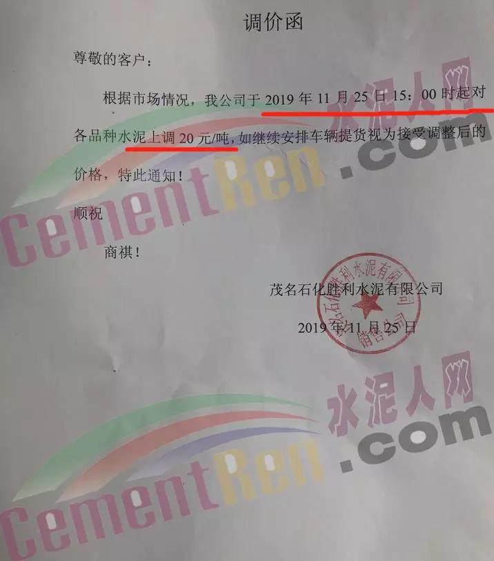 茂名石化胜利水泥有限公司发布了调价函称,根据市场情况,于2019年11月25日15:00时起对品种水泥上调20元/吨。