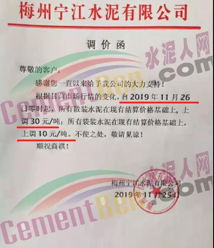 梅州市宁江水泥有限公司发布了调价函称,根据目前市场行情变化,自2019年11月26日零时起,所有散装水泥在现有结算的价格基础上,上调30元/吨,所有袋装水泥在现有结算价格基础上,上调10元/吨。