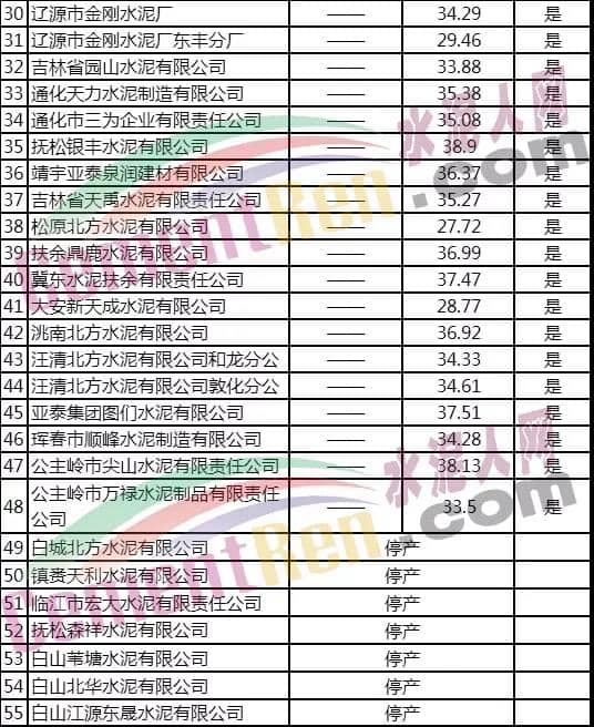 其中得知,55家水泥企业中,白城北方水泥有限公司、镇赉天利水泥有限公司、临江市宏大水泥有限责任公司、抚松森祥水泥有限公司、白山苇塘水泥有限公司、白山北华水泥有限公司、白山江源东晟水泥有限公司7家水泥企业处于停产状态。