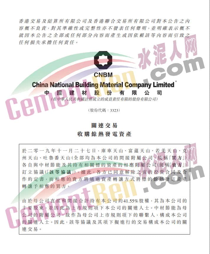 日前,中国建材(03323)发布公告,于2019年11月27日,库车天山、富蕴天山、若羌天山、克州天山、吐鲁番天山(全部均为公司的间接附属公司,统称“买方”)各自与中材节能及其持有相关标的资产的相应附属公司(统称“卖方”)订立协议,各方已同意解除之前的投资合同及合作约定书,而相应的卖方将通过资产转让方式将标的余热发电资产转让予相应的买方。