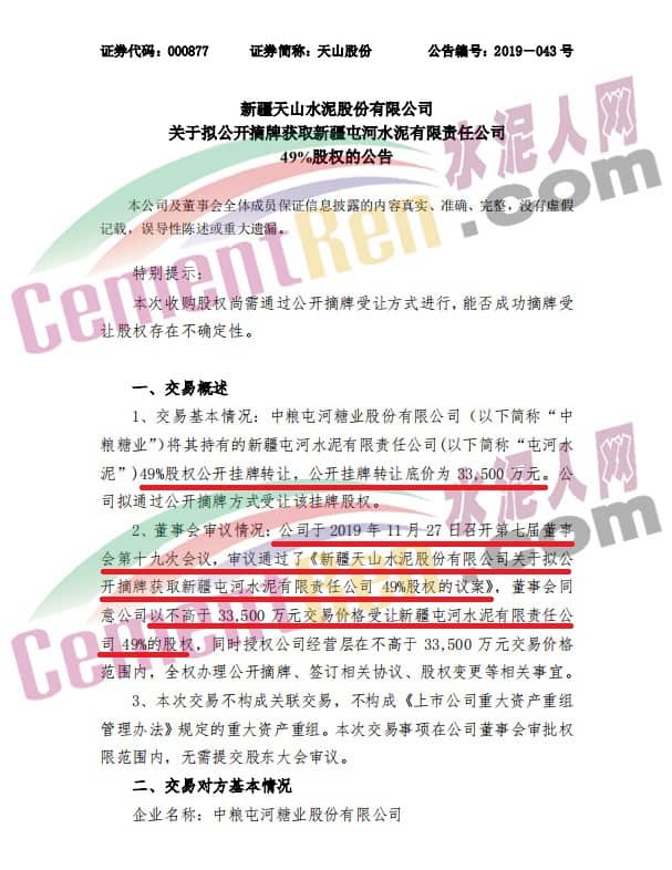 据了解,天山股份于2019年11月27日召开第七届董事会第十九次会议,审议通过了《新疆天山水泥股份有限公司关于拟公开摘牌获取新疆屯河水泥有限责任公司49%股权的议案》,董事会同意公司以不高于33500万元交易价格受让新疆屯河水泥有限责任公司49%的股权,同时授权公司经营层在不高于33500万元交易价格范围内,全权办理公开摘牌、签订相关协议、股权变更等相关事宜。