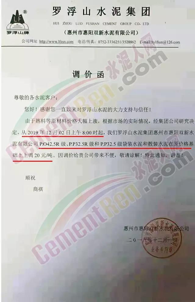 同期,广东珠三角及周边区域也正在进行着一轮水泥价格普涨。其中罗浮山水泥集团惠州市惠阳双新水泥有限公司调价函称,由于熟料等原材料价格大幅上涨,根据市场实际情况,经集团公司研究决定自12月2日上午8时起,罗浮山集团惠阳双新水泥有限公司水泥价格上调20元/吨。