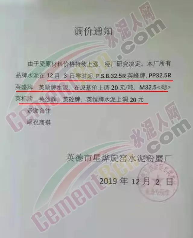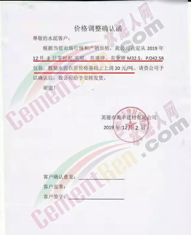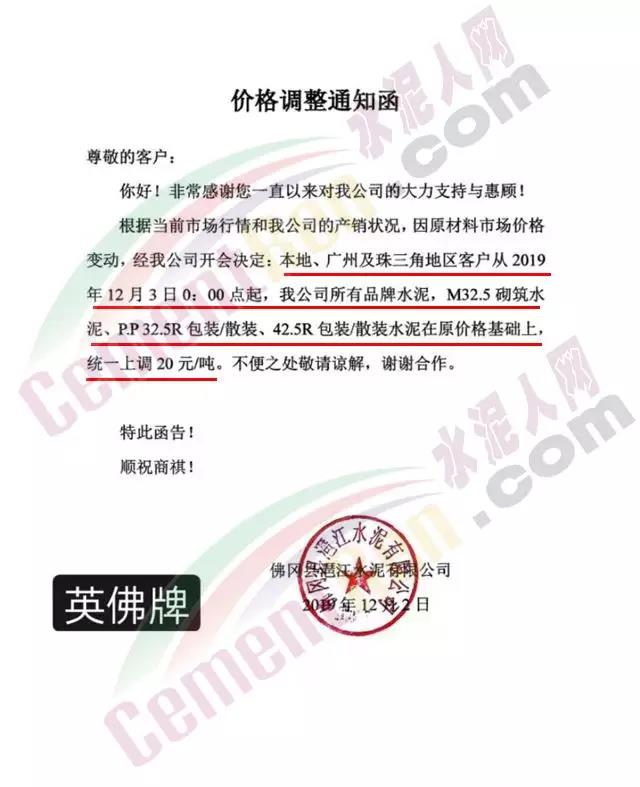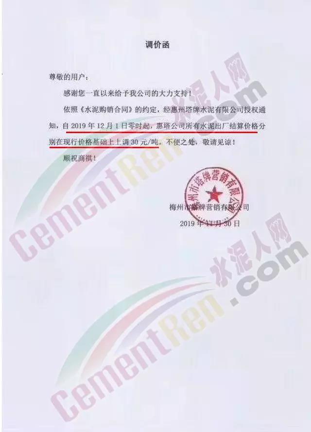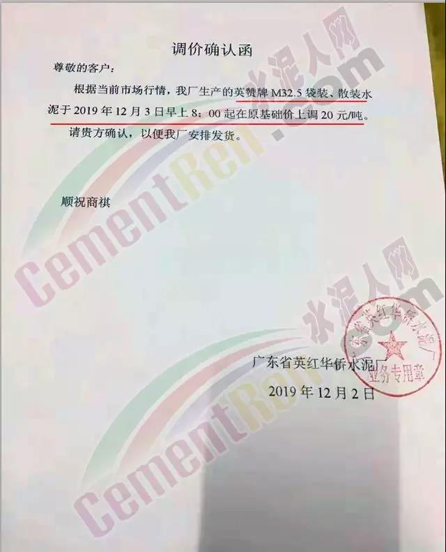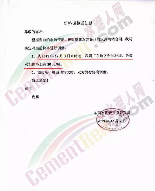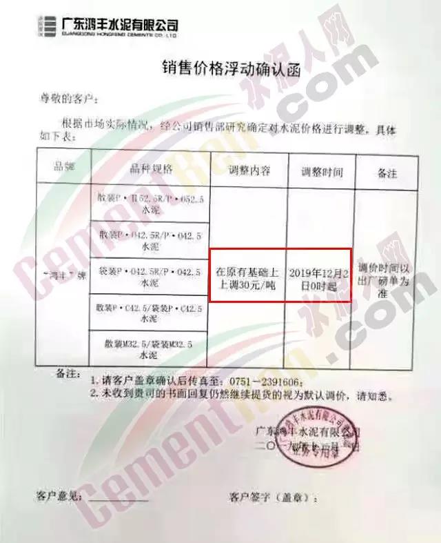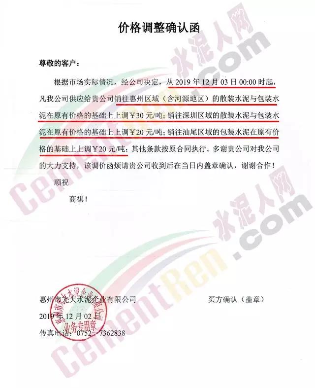 惠州光大水泥价格调整确认函称,自12月3日起销往惠州区域(含河源地区)的散装水泥与包装水泥在原价基础上上调30元/吨;销往深圳区域的上调20元/吨,销往汕尾区域的包装水泥在原价格基础上上调20元/吨。