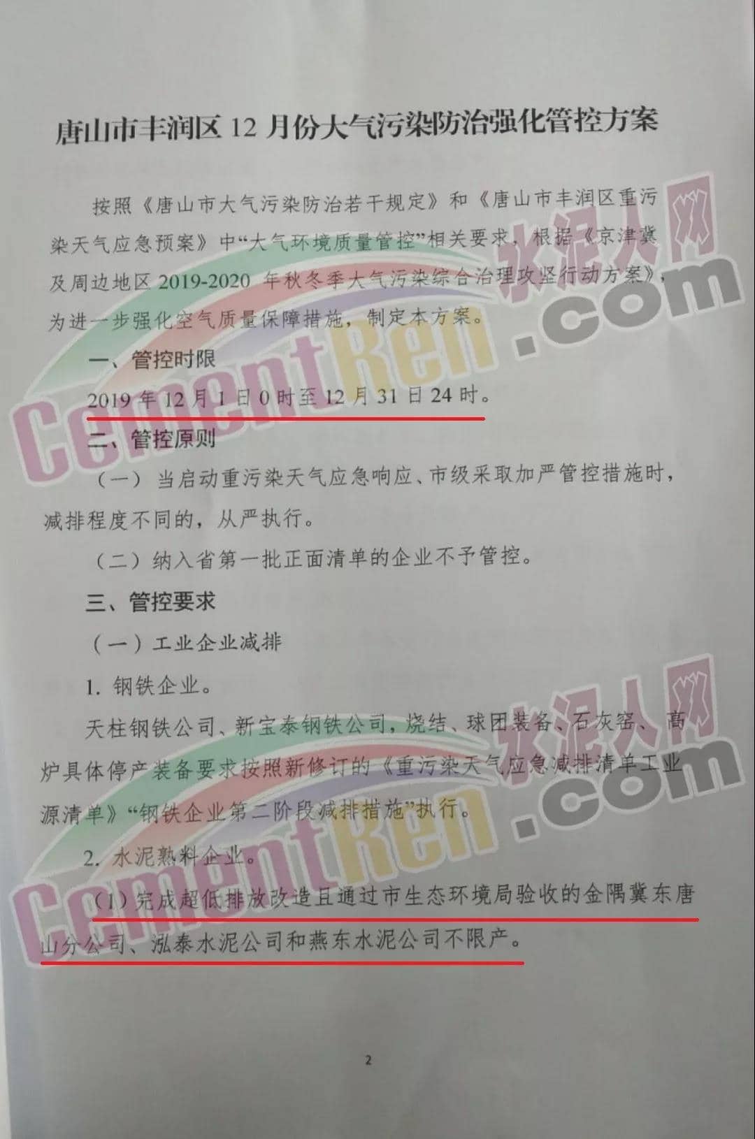 (1) 完成超低排放改造且通过市生态环境局验收的金隅冀东唐山分公司、金隅冀东滦州公司,启新水泥、三友水泥,泓泰泥和燕东水泥不限产。