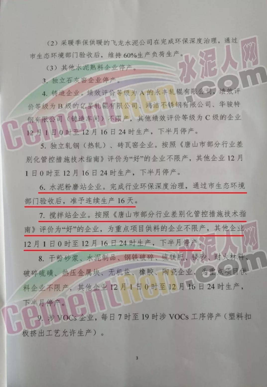 二、水泥粉磨站企业完成行业环保深度治理,通过市生态环境部门验收后,准予连续生产16天。三、搅拌站企业按照《唐山市部分行业差别化管控措施技术指南》评价“好”的企业,为重点项目供料的企业不停产,其他企业12月1日至12月16日24时生产,下半月停产。12月份唐山市大气污染防治强化管控方案如下: