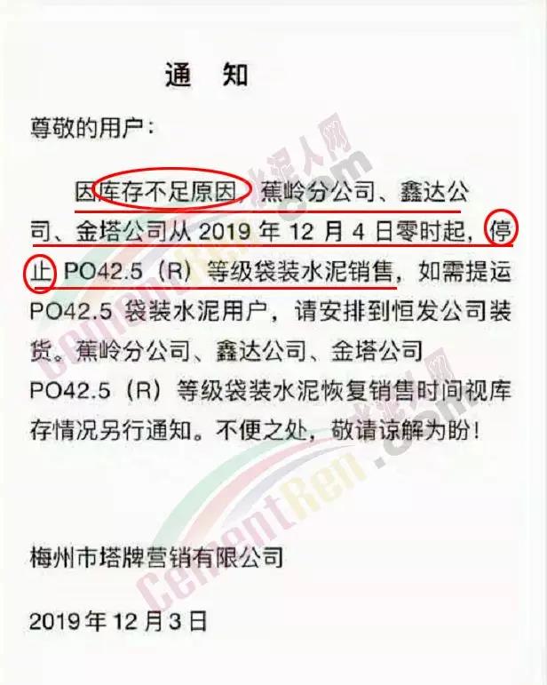 昨日(12月3日),梅州市塔牌营销有限公司发布通知称,因库存不足原因,焦岭分公司、鑫达公司、金塔公司从今日(12月4日)零时起停止PO42.5(R)等级袋装水泥销售,如需提运PO42.5(R)袋装水泥用户,请安排到恒发公司装货。焦岭分公司、鑫达公司、金塔公司PO42.5(R)袋装水泥恢复销售时间视库存情况另行通知。