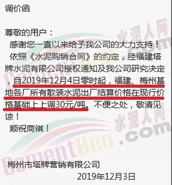 同期,梅州市塔牌营销有限公司还发调价函称自2019年12月4日零时起,福建、梅州基地各厂所有散装水泥出厂结算价格在现行价格基础上上调30元/吨。