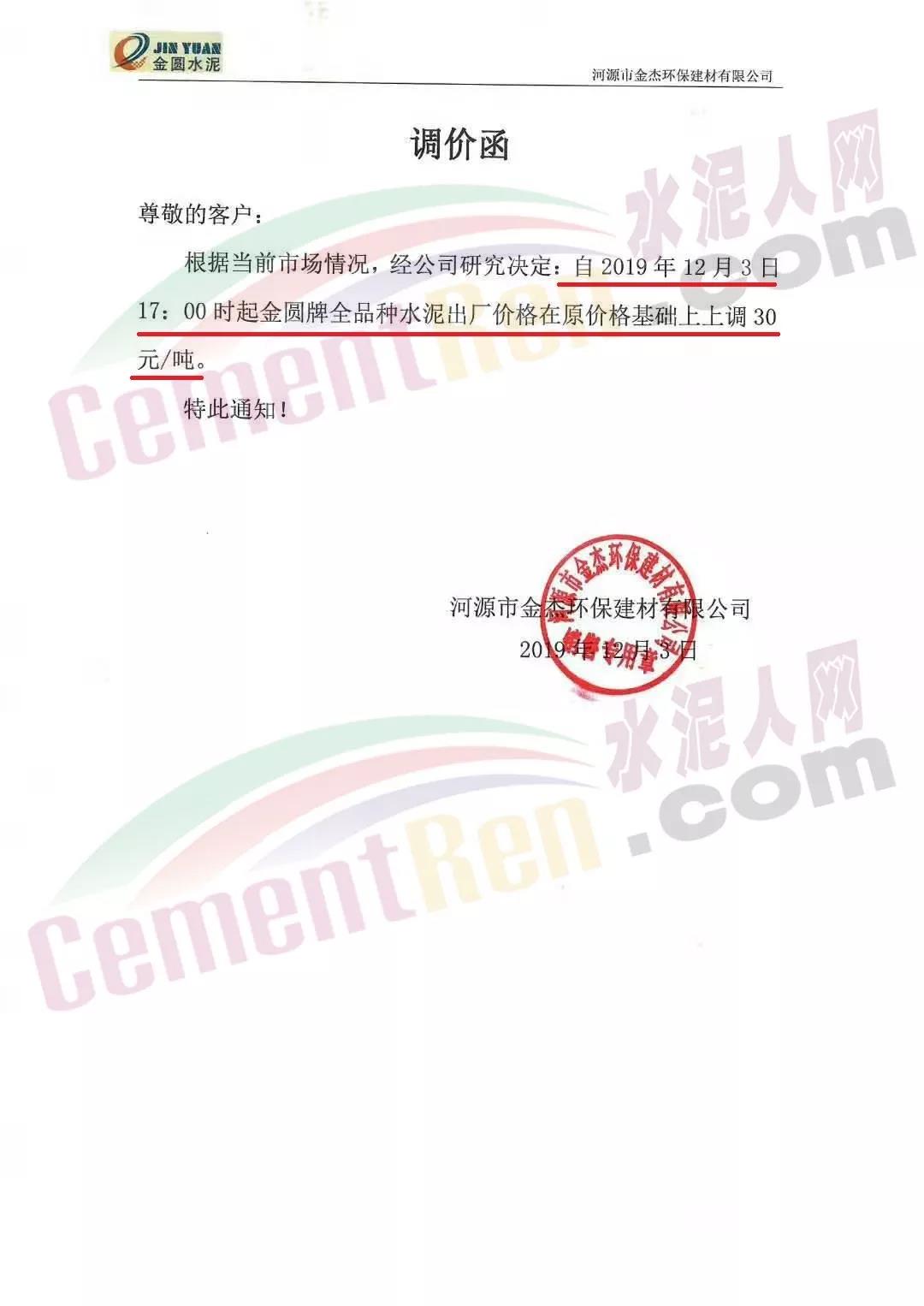 河源市金杰环保建材有限公司12月3日发布了调价函称,根据当前市场情况,经公司研究决定,自2019年12月3日17:00时起金圆牌全品种水泥出厂价格在原基础上上调30元/吨。