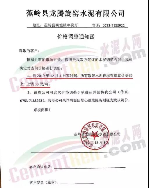 依照《水泥购销合同》的约定,经福建塔牌水泥有限公司授权通知及我公司研究决定,自2019年12月4日零时起,福建、梅州基地各厂所有散装水泥出厂结算价格在现行价格基础上上调30元/吨。不便之处,敬请见谅!