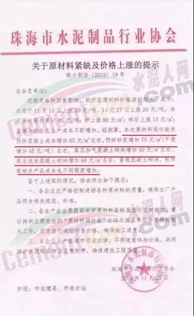 据了解,11月29日珠海市水泥制品行业协会曾发布调价通知称,近期受各种因素影响,行业内原材料波动较大。其中,水泥与11月15日上涨20元/吨、11月27日上涨20元/吨,本月两次涨价累计40元/吨;砂上涨80元/m³;碎石上涨15元/m³。