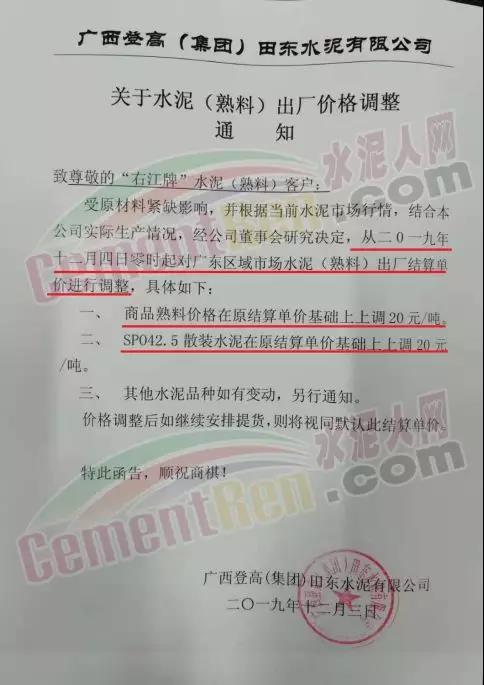 广西登高(集团)田东水泥有限公司也发布调价通知称,收原材料紧缺影响,并根据当前水泥市场行情,结合实际生产情况,经董事会研究决定,从2019年12月4日0时起对广东区域市场(熟料)进行调整,商品熟料价格在原结算单价基础上上调20元/吨,SP042.5散装水泥在原结算单价基础上上调20元/吨,其他水泥品种如有变动,另行通知。