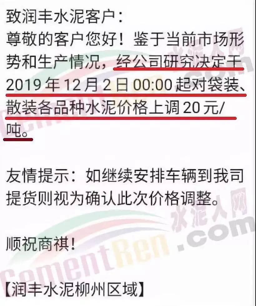 广西柳州润丰水泥涨价通知称,鉴于当前市场形势和生产情况,经公司研究决定于2019年12月2日00:00起对袋装、散装各品种水泥价格上调20元/吨。