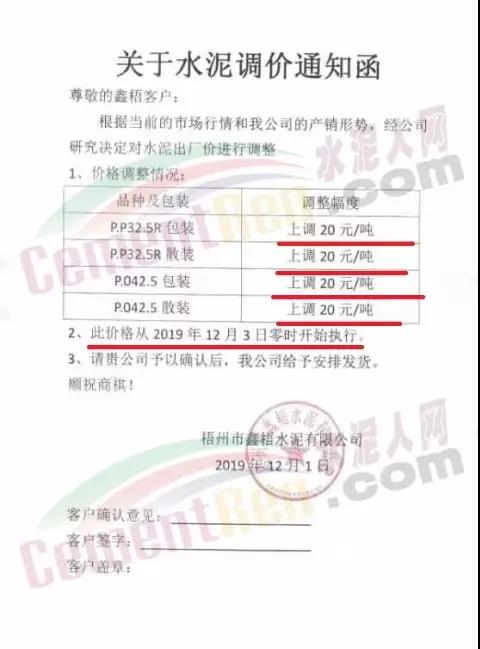 华润水泥广西市场部梧州区域发通知称, 根据当前市场形势及产销存实际情况,经公司研究决定,定于2019年12月3日00:00起对袋装、散装各品种水泥价格上调20元/吨。