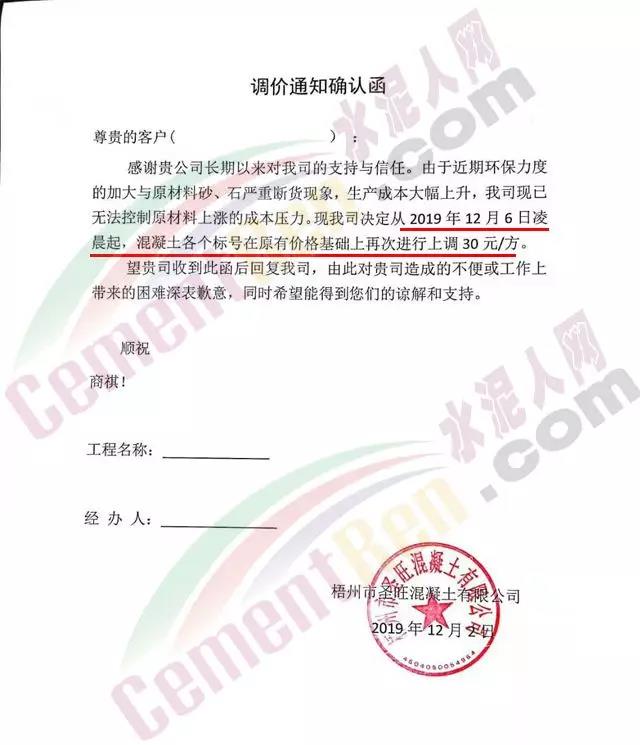 12月2日梧州市圣旺混凝土有限公司调价通知称由于近期环保力度的加大与原材料砂、石严重断货,生产成本大幅上升,公司已无法控制原材料上涨的成本压力。经公司研究决定 自12月6日凌晨起,混凝土各标号在原有价格上再次进行上调30元/方。
