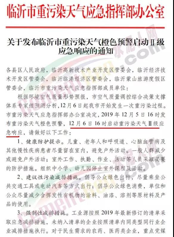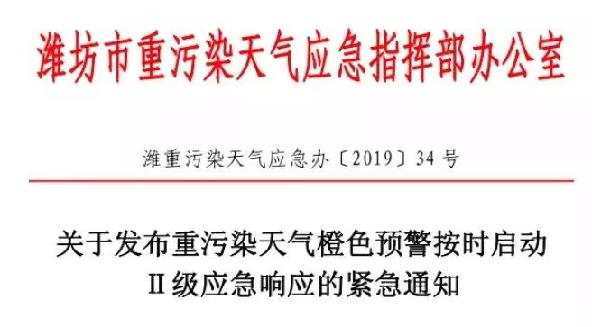 12月5日,山东省潍坊市重污染天气应急指挥部办公室发布《关于发布重污染天气橙色预警按时启动Ⅱ级应急响应的紧急通知》称:潍坊市自2019年12月5日12时发布重污染天气橙色预警,12月6日12时启动Ⅱ级应急响应。