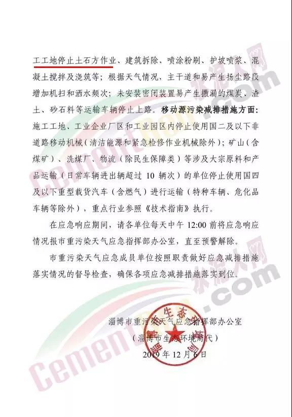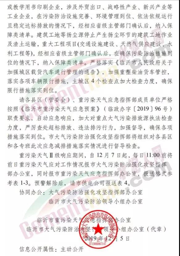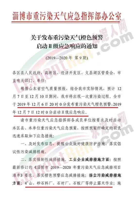 按照《潍坊市重污染天气应急预案》相关要求,Ⅱ级应急响应启动后,工业企业要按照最新修订的应急减排清单采取限产停产等减排措施;建筑工地等扬尘源停止产生扬尘环节的建筑施工作业及渣土运输;加强重型柴油货车管控措施,最大限度减少上路运输行驶。 泰安市根据空气质量状况,山东泰安市重污染天气应急工作小组决定,自2019年12月5日20时起 ,在泰山区,岱岳区满庄镇、大汶口镇、天平街道、粥店街道,新泰市楼德镇,宁阳县磁窑镇、华丰镇,高新区范围内发布重污染天气橙色预警,自2019年12月6日12时起 ,启动Ⅱ级应急响应。