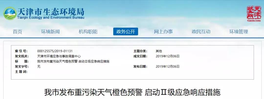 根据我市空气质量预测和会商结果,受不利气象条件影响,2019年12月7日下午起我市将出现重度污染过程,符合《天津市重污染天气应急预案》(津政办发〔2019〕40号)规定的重污染天气橙色预警条件。经市人民政府批准,现发布重污染天气橙色预警,从12月7日14时起启动Ⅱ级(橙色)应急响应。一、强制性减排措施1.工业企业按照重污染天气应急减排清单,严格落实相应的应急减排措施。2.停止室外建筑拆除、喷涂、粉刷、切割、护坡喷浆作业。3.除涉及重大民生工程、安全生产及应急抢险任务外,停止所有施工工地的土石方作业(包括停止土石方开挖、回填、场内倒运、掺拌石灰、混凝土剔凿等作业,停止建筑工程配套道路和管沟开挖作业)。4.未安装密闭装置的煤炭、建筑垃圾、渣土、砂石料等运输车辆禁止上路行驶。5.除涉及重大民生工程、安全生产及应急抢险任务外,施工工地、工业企业厂区和工业园区内,停止使用国家第二阶段及以下非道路移动机械(清洁能源和紧急检修作业机械除外)。6.除涉及重大民生工程、安全生产及应急抢险任务外,所有水泥粉磨站、渣土存放点全面停止生产、运行;全市混凝土搅拌站和砂浆搅拌站停止生产,严格落实封闭、苫盖等降尘措施,并增加洒水降尘频次。7.各区采取科学措施,根据空气温度及相对湿度,对辖区内主要道路适时调整湿法作业频次,降低湿法作业频次时应适当加大吸扫作业力度。8.本市及外埠中型重型载货汽车在本市行政区域内道路(高速公路除外)全天按车牌尾号单双号行驶(保证安全生产运行,运输民生保障物资或特殊需求产品,承担急救、抢险等任务,挂新能源牌照及本市未更换新能源牌照的新能源汽车除外)。本市及外埠中型重型载货汽车在外环线以内道路的日常车牌尾号限行措施暂停执行,其他限行措施继续执行。9.港口集疏运机动车进出港区全天按车牌尾号单双号行驶(保证安全生产运行,运输民生保障物资或特殊需求产品,以及为外贸货物、进出境旅客提供港口集疏运服务的,挂新能源牌照及本市未更换新能源牌照的新能源汽车除外)。10.港口、物流(除民生保障类)等涉及大宗物料和产品运输(日常车辆进出量超过10辆次)的单位停止使用国家第四阶段及以下重型载货汽车(含燃气)进行运输(特种车辆、危化品车辆等除外)。