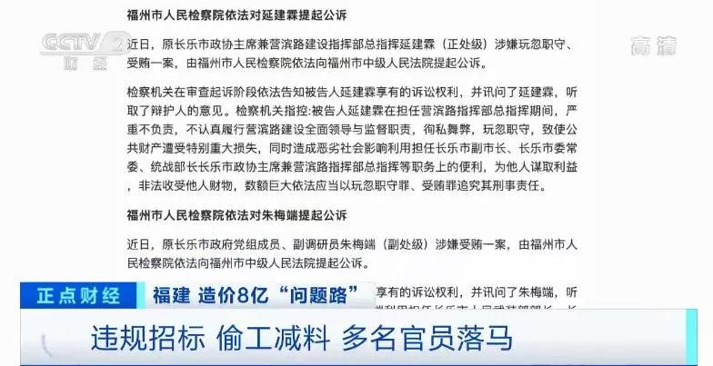 违规招标 偷工减料,多名官员落马营滨路通车没多久,道路沉降、路面裂缝、坑洞等问题,就引来当地群众强烈不满,老百姓的多次投诉引起了相关部门的高度重视。2018年,福州市纪监委等相关部门介入调查。日前,福州市人民检察院发布通报,依法对长乐营滨路建设指挥部两位涉嫌贪腐官员提起公诉。当地政府官方公布,营滨路存在违规招标、偷工减料等严重问题。根据当地政府今年11月公布的调查结果,营滨路不仅存在违规招标、大面积围串标等问题,而且工程监管严重缺位。