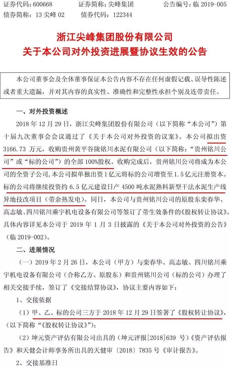 据了解,这条生产线是浙江尖峰集团股份有限公司出资3166.73万元收购的贵州黄平谷陇铭川水泥有限公司(贵州铭川公司)。收购完成后,贵州铭川公司成为尖峰的全资子公司,并由尖峰拟单独出资1亿元将其注册资本增资至1.5亿元,又投资约6.5亿元建设日产4500吨水泥熟料新型干法水泥生产线异地技改项目(带余热发电)。今年2月28日,浙江尖峰集团股份有限公司《关于本公司对外投资进展暨协议生效的公告》中披露了该收购的进展情况。截止公告日,原股东所持标的公司股份已全部过户至本公司名下并完成了工商变更登记手续,尖峰集团已持有贵州铭川公司100%股权。