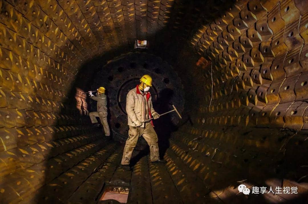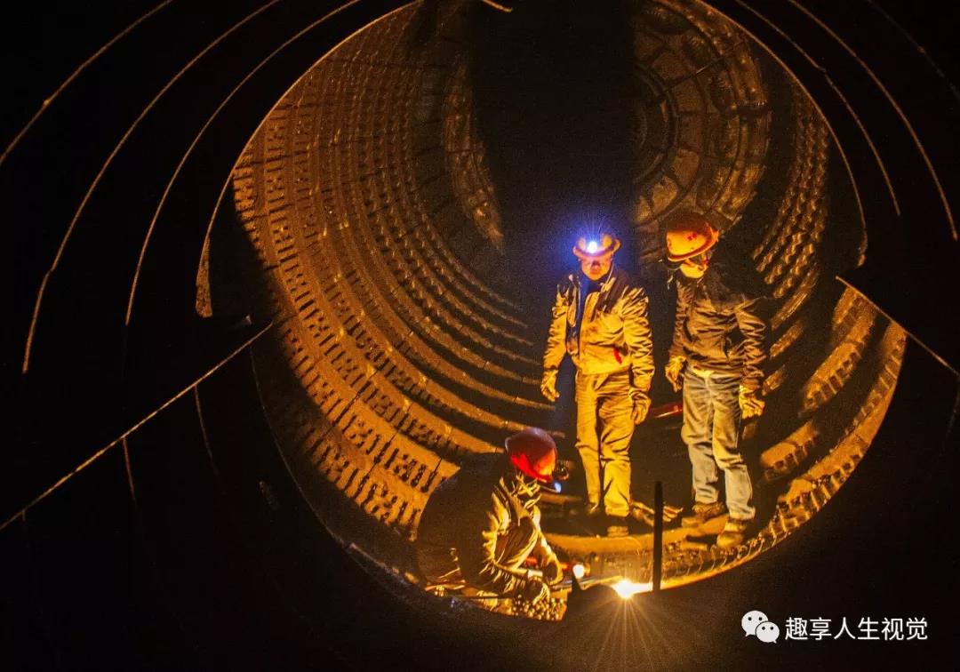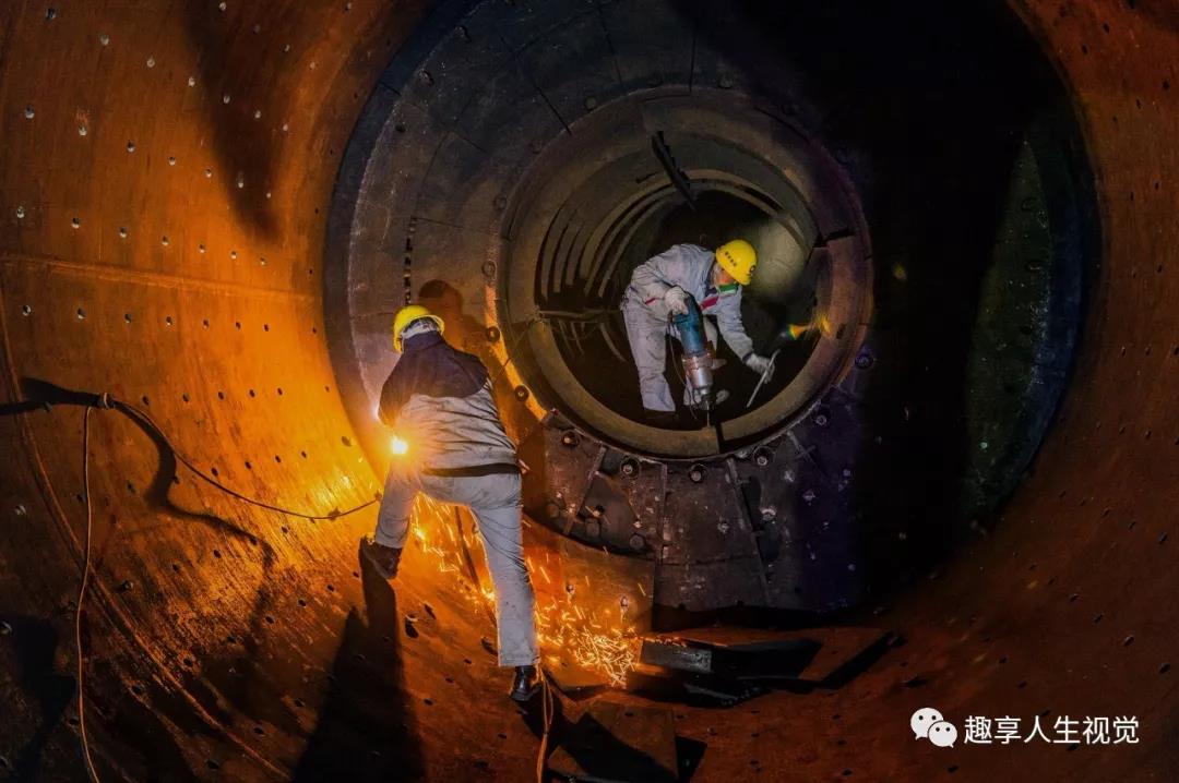 2019年2月14日常德南方水泥,工段长郭学松在磨机内对焊接处进行检测。