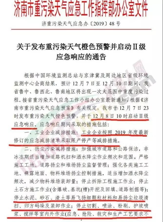 以山东济南市重污染天气应急工作指挥部办公室发布《关于发布重污染天气橙色预警并启动Ⅱ级应急响应的通告》为例,12 月 7 日 23 时发布重污染天气橙色预警,并于 12 月 8 日 10 时启动Ⅱ级应急响应。