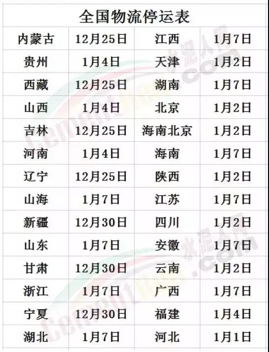 时至年底,随着天气寒冷和最近雾霾天气严重,物流部发出声明,全国物流停运时间已经确定:内蒙古、西藏、吉林、辽宁等地12月25日停运;新疆、甘肃、宁夏等地12月30日停运;河北1月1日停运;天津、北京、陕西、四川、云南等地1月2日停运;福建、贵州、山西、河南等地1月4日停运;上海、山东、浙江、湖北、江西、湖南、海南、江苏、安徽、广西等地1月7日停运。