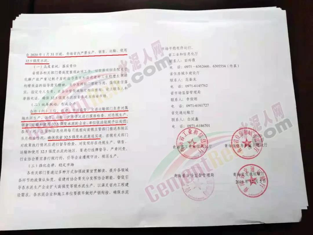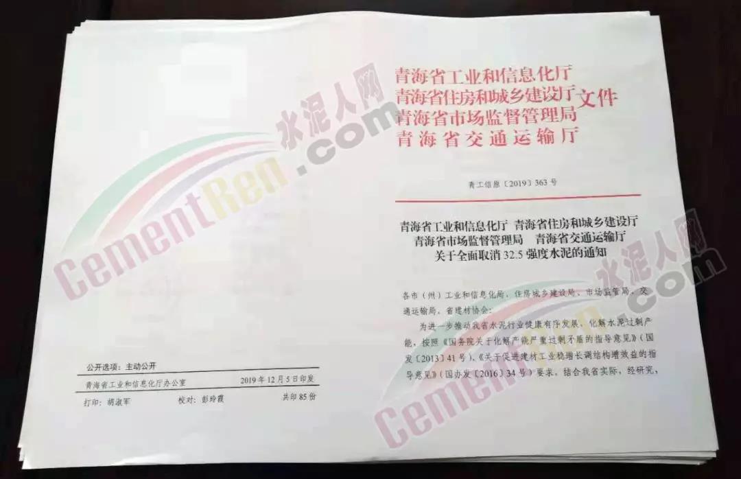 为进一步推动我省水泥行业健康有序发展,化解水泥过剩产能,按照《国务院关于化解产能严重过剩矛盾的指导意见》(国发(2013]41号)、《关于促进建材工业稳增长调结构增效益的指导意见》(国办发[2016]34号)要求,结合我省实际,经研究,自2020年1月31日起,青海省内严禁生产、销售、运输、使用32.5强度水泥。