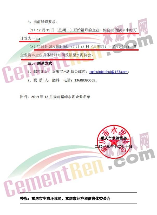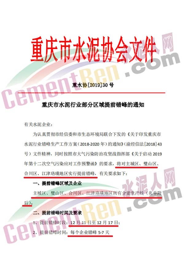 11月10日,重庆市水泥协会发布了《重庆水泥行业部分区域提前错峰的通知》称,为认真贯彻经信委和市生态环境局联合下发的《关于印发重庆市水泥行业错峰生产工作方案(2018-2020年)的通知》(渝经信法[2018]43号)文件精神,同时按照市大气污染防治攻坚战指挥部《关于启动2019年第十二次空气污染应对工作预警函》的要求,对主城区、璧山区、合川区、江津珞璜地区实行提前错峰,提前错峰时段为12月11日至12月17日,每个企业错峰5至7天。具体如下: