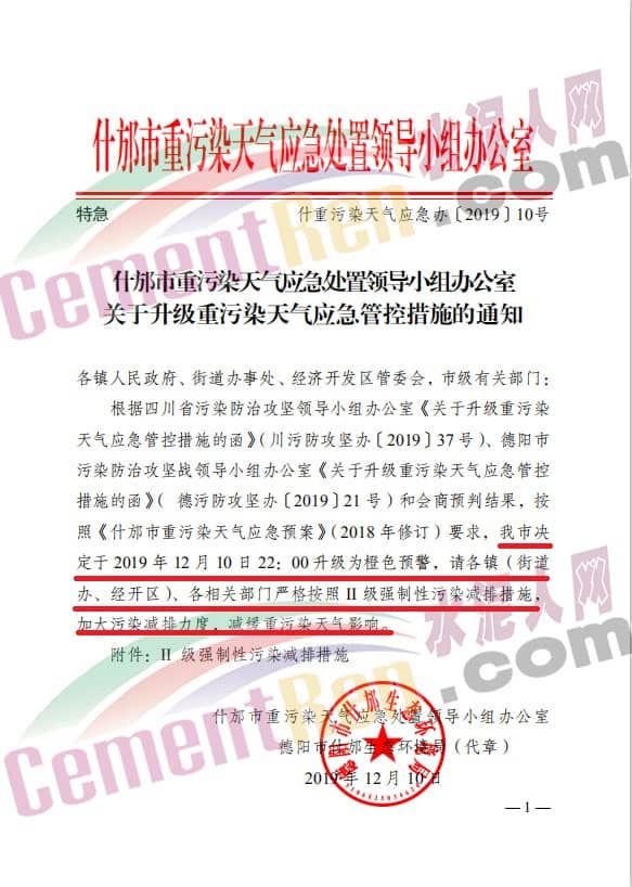 12月10日,四川省什邡市重污染天气应急处置领导小组办公室和德阳市生态环境局联合发布了《关于升级重污染天气应急管控措施的通知》称,根据四川省污染防治攻坚领导小组办公室《关于升级重污染天气管控应急措施的函》(川污防攻坚办[2019]37号)、德阳市污染防治攻坚战领导小组办公室《关于升级重污染天气应急管控措施的函》(德污防攻坚办[2019]21号)和会商预判结果,按照《什邡市重污染天气应急预案》(2018年修订)要求,决定于2019年12月10日22:00升级橙色预警。具体减排措施如下: