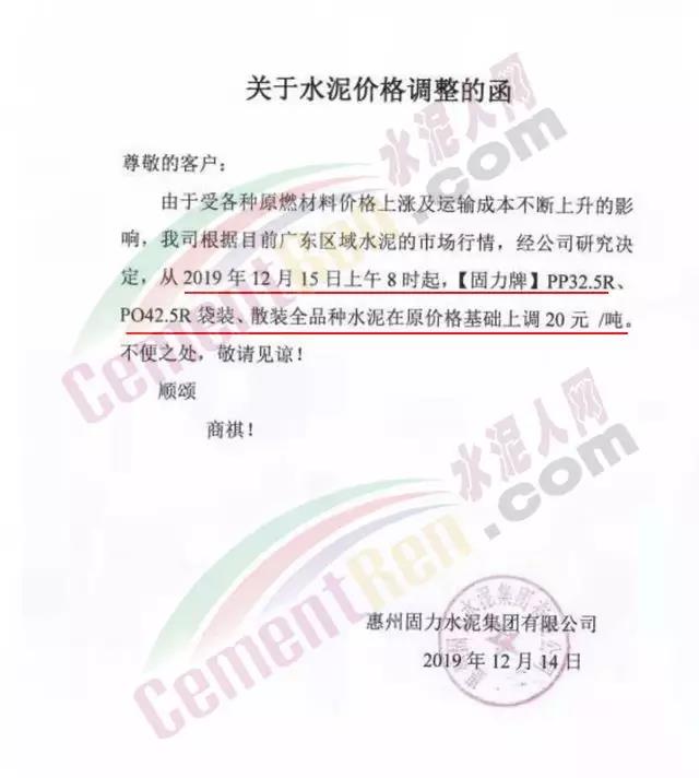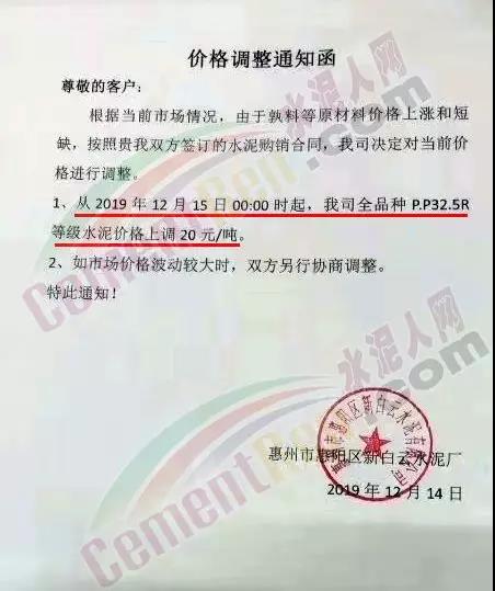惠州市力塔水泥有限公司调价函称由于各种原材料价格不断上涨,原材料从应严重不足及水泥库位低,经研究决定自今日(15日)零时起,公司生产的所有品种散装水泥和包装水泥在原价基础上上调20元/吨。