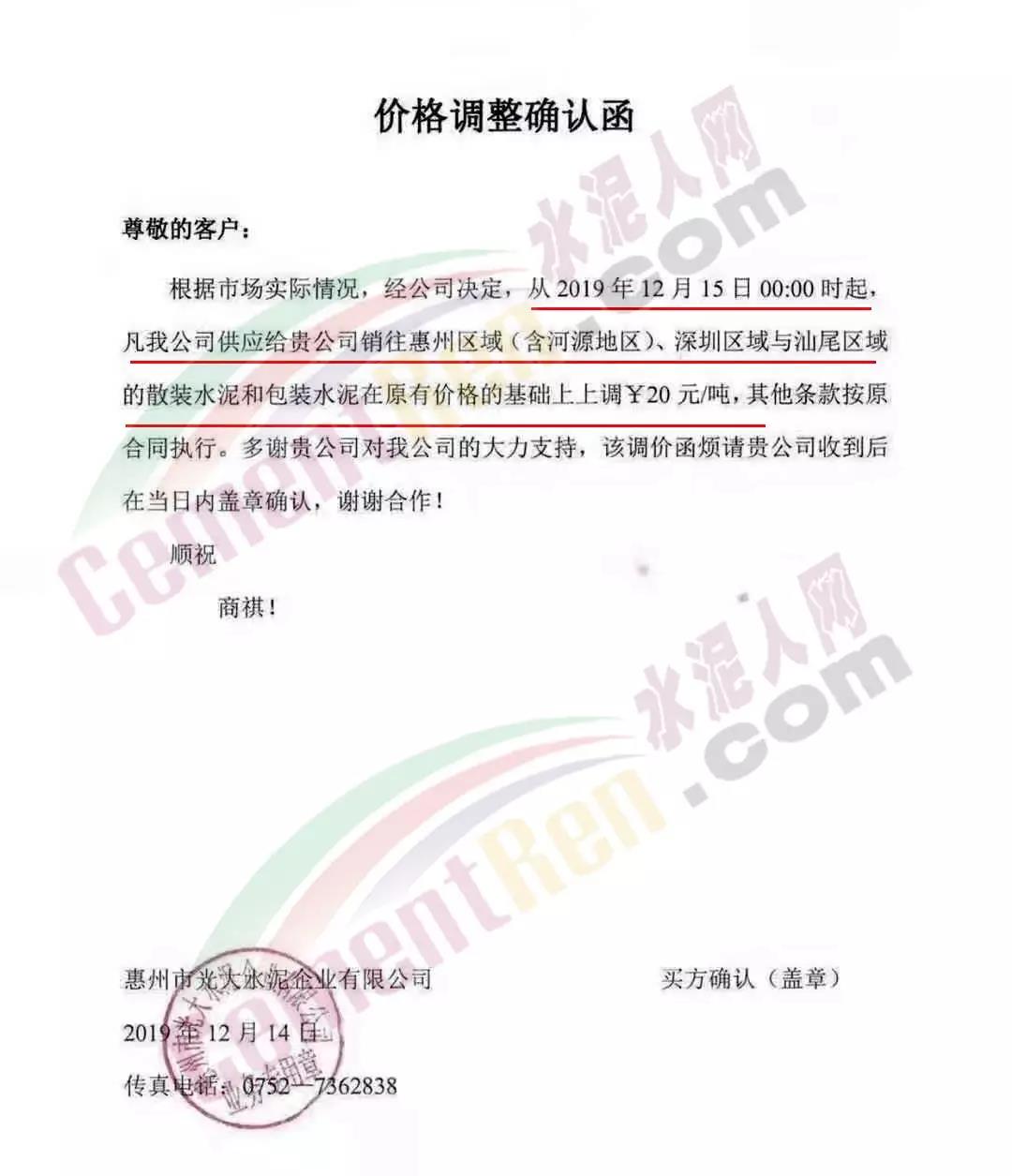 惠州光大水泥调价函称,从今日(15日)0时起,公司销往惠州区域(含河源地区)、深圳区域与汕尾区域的散装水泥和包装水泥在原价基础上上调20元/吨。