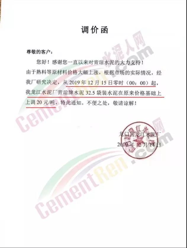 龙门县龙江水泥厂调价函称,由于熟料等原材料价格大幅上涨,根据市场的实际情况,经研究决定自今日(15日)零时起,龙江水泥厂青琼牌水泥32.5袋装在原价基础上上调20元/吨。