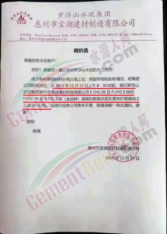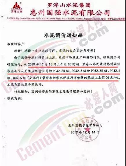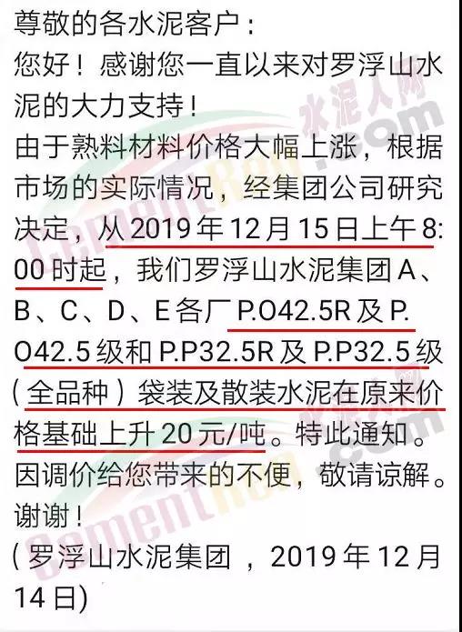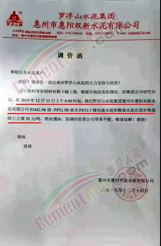 罗浮山水泥集团惠州市惠阳双新水泥有限公司调价函称由于熟料等原材料价格大幅上涨,根据市场实际情况,经集团公司研究决定各标号水泥包装和散装水泥在原价基础上上调20元/吨。