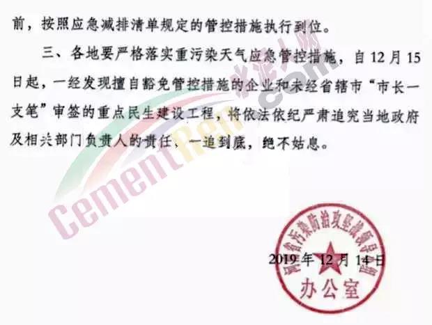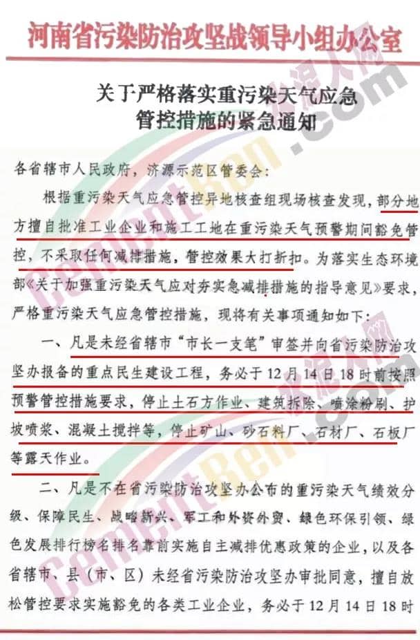 上述通知要求,凡是未经省辖市”“市长一支笔”审签并向省污染防治攻坚办报备的重点民生建设工程,务必于12月14日18时前按照预警管控措施要求,停止土石方作业、建筑拆拆除、喷涂粉刷、护坡喷浆、混凝土搅拌等,停止矿山、砂石料厂、石板厂、石材厂等露天作业。凡是不在省污染防治攻坚办公布的重污染天气绩效分级、保障民生、战略新兴、军工和外资外贸、绿色环保引领、绿色发展排行榜 排名靠前实施自主减排优惠政策的企业,以及各省辖市、县 (市、区)未经省污染防治攻坚办审批同意,擅自放松管控要求实施豁免的各类工业企业,务必于12月14日18时前,按照应急减排清单规定的管控措施执行到位。各地要严格落实重污染天气应急管控措施,自12月15日起,一经发现擅自豁免管控措施的企业和未经省辖市“市长一支笔”审签的重点民生建筑工程,将依法依纪严肃追究当地政府及相关部门负责人的责任,一追到底,绝不姑息。 通知原文如下: