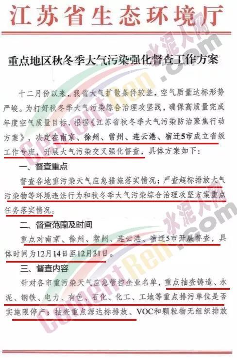 同期,江苏省生态环境厅发布《重点地区秋冬季大气污染强化督查工作方案》指出督查范围为南京、徐州、常州、连云港、宿迁5市开展督查,具体时间为12月14日至12月31日。针对各市重污染天气应急管控企业名单,重点抽查铸造、水泥、钢铁、电力、有色、石化、化工、工地等重点排污单位 是否实施停限产;抽查重点源达标排放VOC颗粒物无组织排放情况,是否存在 无治污设计 ,偷排、篡改或者伪造监测数据、不正常运行大气污染物防治设施等逃避监管的方式排放大气污染物和超标排污等环境违法行为等。方案全文如下: