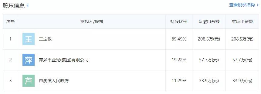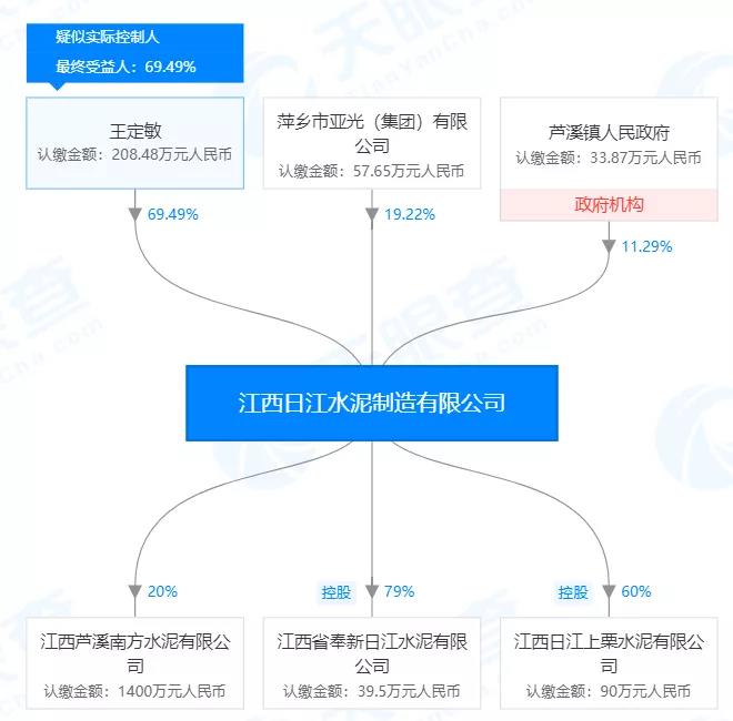 相关数据显示江西日江水泥制造有限公司疑似实际控制人王定敏拥有企业69.49%的股份,为第一大股东;第二大股东为萍乡市亚光(集团)有限公司,占股19.22%。第三大股东为芦溪镇人民政府,占股11.29%。