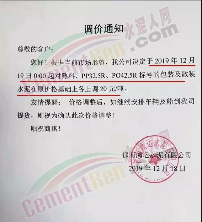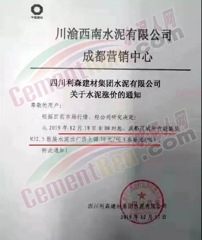 四川利森建材集团涨价通知称,自12月18日零时起,成都区域所有袋装及M32.5散装水泥出厂价上调30元/吨。