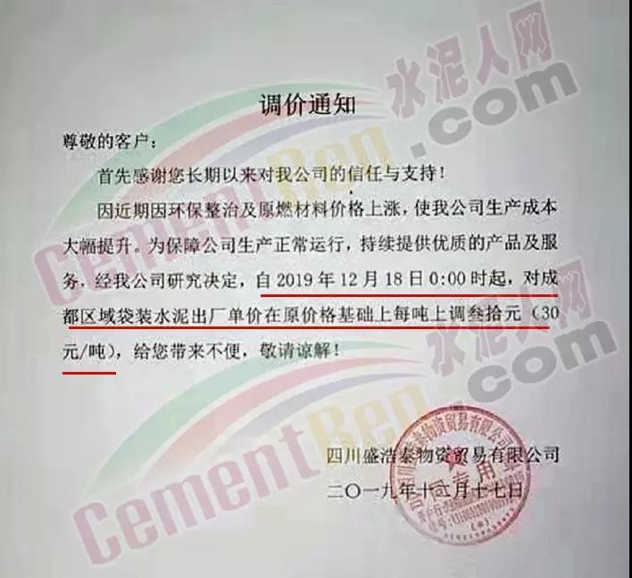 四川盛浩泰物资贸易有限公司调价通知称,自12月18日零时起,对成都区域袋装水泥出厂单价在原价格基础上上调30元/吨。