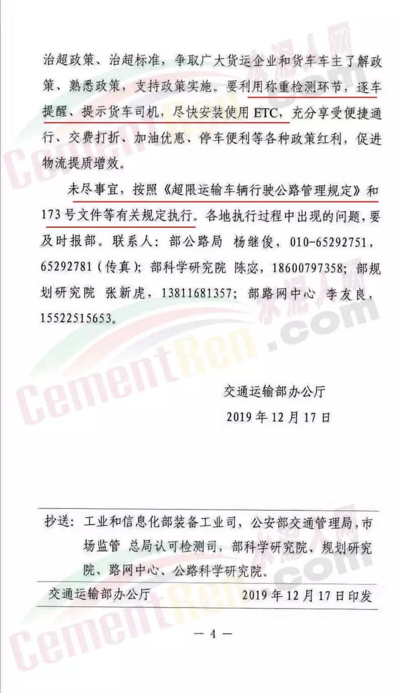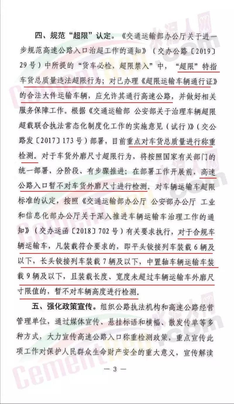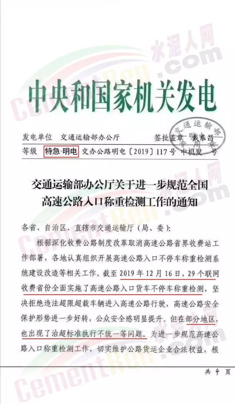但是,因部分地区出现了治超标准执行不统一等问题,令物流运输车司机无所适从,尤其是水泥运输车辆,举个例子,总重36吨的四桥车在执行地方标准的陕西上了高速,但进入到执行国家标准的甘肃后,标载是31吨,要求卸货至标准值,并接受处罚。对货车司机来说损失就大了。不过,也有货车司机表示,希望货车的最高载重可以恢复55吨,各车型都恢复以前的限值,现在的制度大浪费资源了,而且,货车司机根本伤不起!前四后八的自卸车规定31吨,车自重就有18吨,只能拉13吨货,跑一趟下来,还不够油钱。 12月17日,交通运输部办公厅发布特急文件《关于进一步规范全国调整公路入口称重检测工作的通知》(交办公路明电【2019】117号)(以下简称“《通知》”)。《通知》直指全国部分地区治超标准不统一的问题。为进一步规范高速公路入口称重检测工作,切实维护公路货运企业合法权益,根据相关法律法规和规定,有关通知如下: