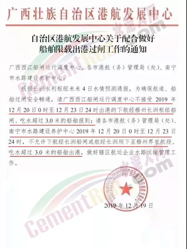 12月19日广西壮族自治区港航发展中心发布《自治区港航发展中心关于配合做好船舶限载出港过闸工作的通知》称:根据长洲水利枢纽未来4日水情预测通报,为确保航道、船舶过闸安全畅通,请广西西江船闸运行调度中心不接受2019年12月20日0时至12月23日24时出港的下航经梧州长洲枢纽船闸、吃水超过3.0米的船舶报到;请各市港航(务)管理局(处)、南宁市水路建设养护中心2019年12月20日0时至12月23日24时,不允许下航经长洲船闸或航经长洲坝下至梧州界首航段、吃水超过3.0米的船舶出港,做好辖区航运企业水路运输管理工作。