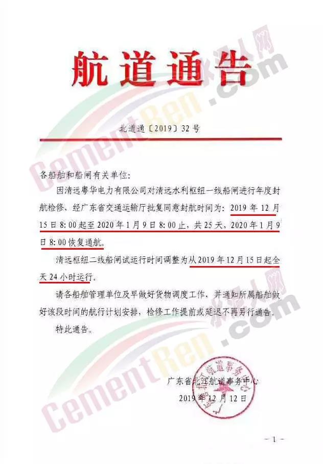 在这之前广东省北江航道事务中心也发布第32号航道通告称,因清远粤华电力有限公司对清远水利枢纽一线船闸进行年度封航检修,经广东省交通运输厅批复同意封航时间为2019年12月15日8时起至2020年1月9日8时止,共25天,1月9日8时恢复通航。